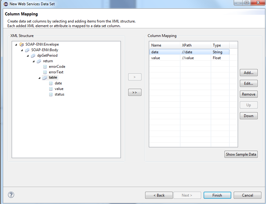 The Column Mapping defines the columns for the table row. The columns are mapped to child elements or attributes within the selected data row element. In contrast to row mapping, you can select several elements. Select an element from the window on the left and click on the > button. The Column mapping window is opened. Select the data type from the combo box as well as the option "XML elements named "<element>" at any location". Click on the OK button.