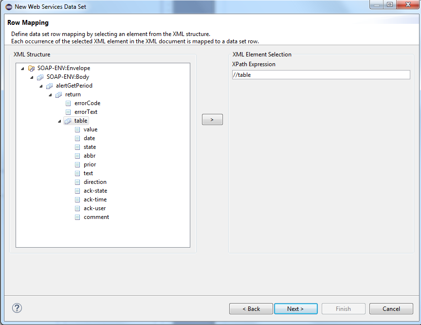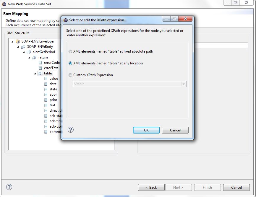 Use the Row Mapping to select which XML element is added as a new data set row. Each occurrence of the selected XML element is linked with a new data set row. Select "table" and click on the > button to select the XPath Expression (the selected element in the XML structure). You can pass an absolute, a relative or a user-defined path. A Path starting with a slash / is absolute, a path starting with // is relative.