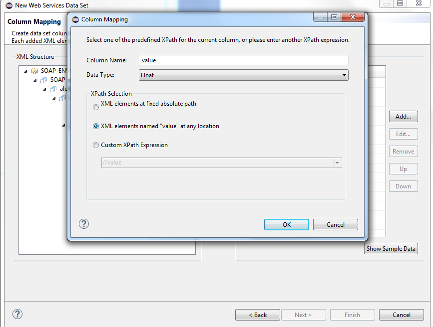 Select the data type "float" from the combo box as well as the option "XML elements named "value" at any location". Click on the OK button.