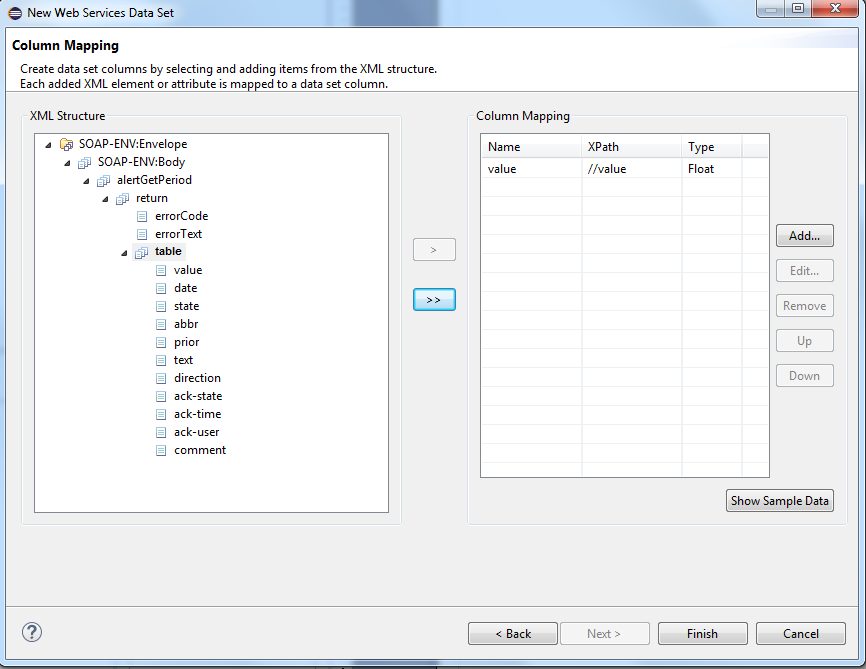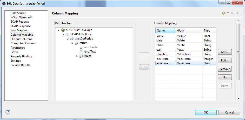 Column Mapping defines the columns for the table row. The columns are mapped to child elements or attributes within the selected data row element. In contrast to row mapping, you can select several elements. Select an element from the window on the left and click on the > button. The Column mapping window is opened