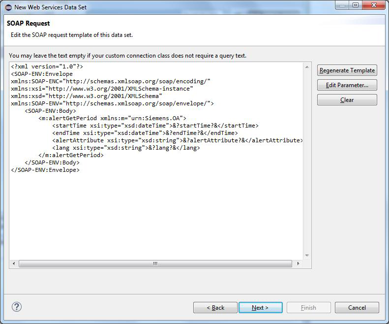 In order to retrieve values from WinCC OA, the generated SOAP request is transferred to the WinCC OA Reporting Manager in XML format. The SOAP request contains the dynamic parameters which are replaced by the queried values.