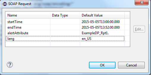Here you can specify default values in the same way as in the SOAP request earlier. These settings do, however, not have an influence on the output (Show Sample Data) in the column mapping but on the preview results. Furthermore, you can link the parameters with the report parameters here.