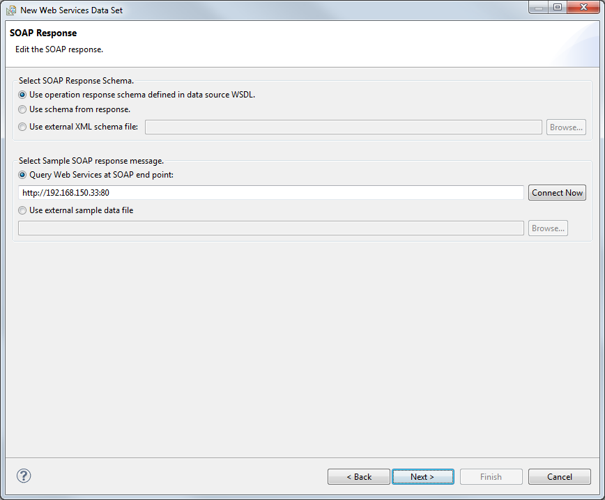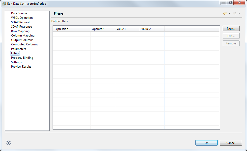 The Edit Data Set menu can be opened by double-clicking the data set in the data explorer. You can edit the entire data set configuration. The menu items Data source, WSDL operation, SOAP request, SOAP response, Row Mapping and Column Mapping are identical to the already described steps and are therefore not described in detail here.