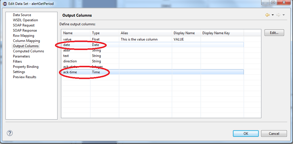 The BIRT tool queries dates and time as strings by default. You can, however, change the data type for dates and time in the output columns (see further below).