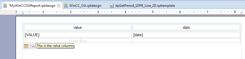 The display name "VALUE" and the alias name "This is the value column) (as a tooltip) are shown in the template (in edit mode):