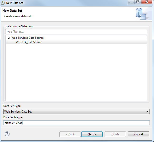 Choose the data source and enter a name for the data set. The Data Set Type is automatically set to "Web Services Data Set" and does not have to be changed.