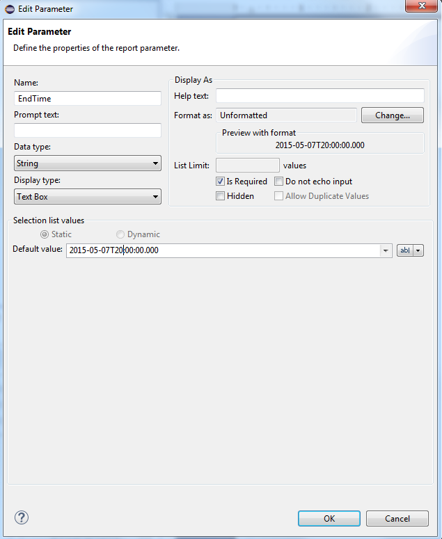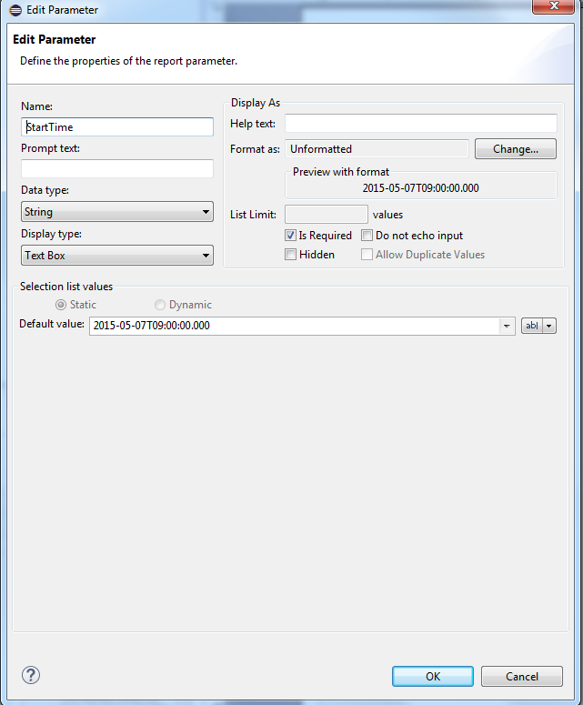 Name the parameter (e.g. StartTime) and define the default value. For a report parameter linked with the StartTime parameter of the function dpGetPeriod, the configuration looks as follows: