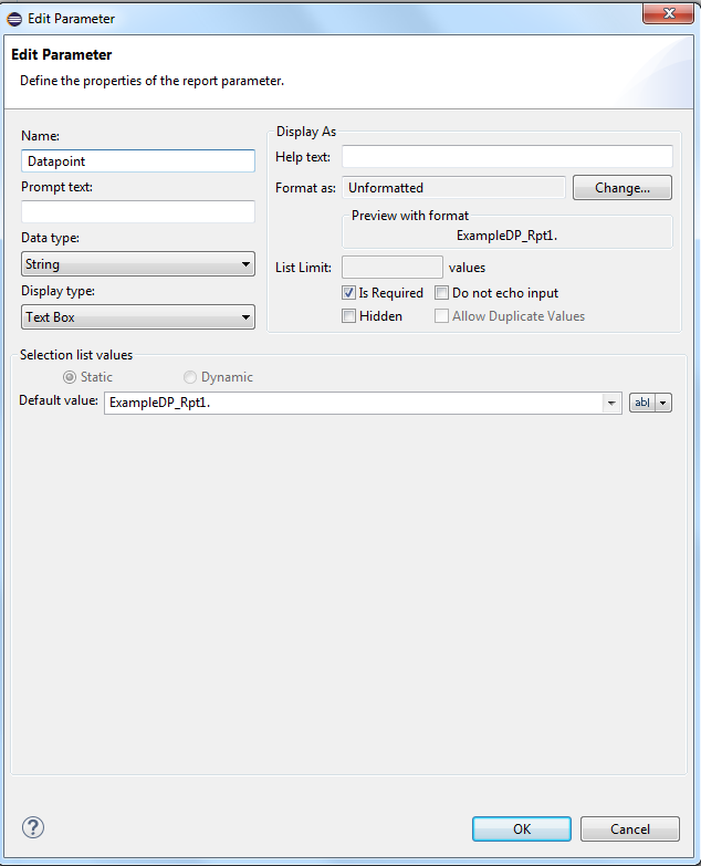 Name the parameter (e.g. Datapoint) and specify the default value. For a report parameter linked with the dpName parameter of the function dpGetPeriod, the configuration looks as follows: