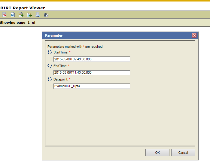 You can select the previously created report parameter from the Linked To Report Parameter combo box. After linking all parameters (in this example with the report parameters StartTime, EndTime and Datapoint), the overview should look as follows: