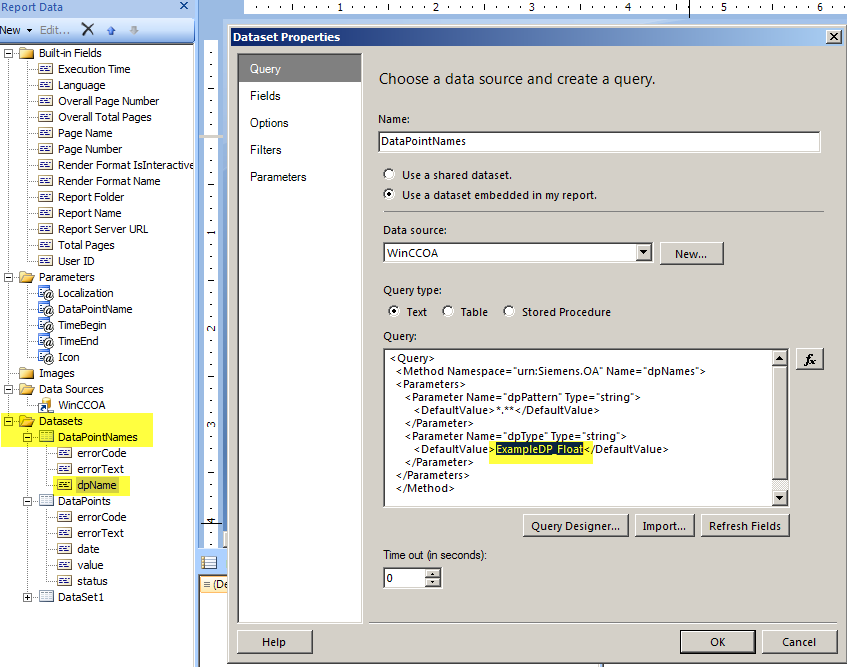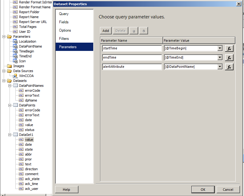 Figure 9. The global parameter "DataPointName" is used for the local parameter "alertAttribute" of the data set "DataSet1" and for the query "alertGetPeriod"