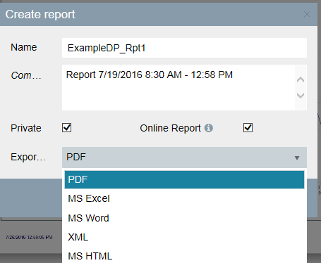 You can now create a report by clicking the "Create report" button. A window is opened. Select the report format from the combo box and enter a name and a description.