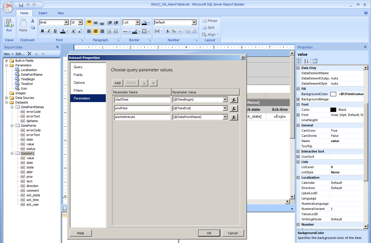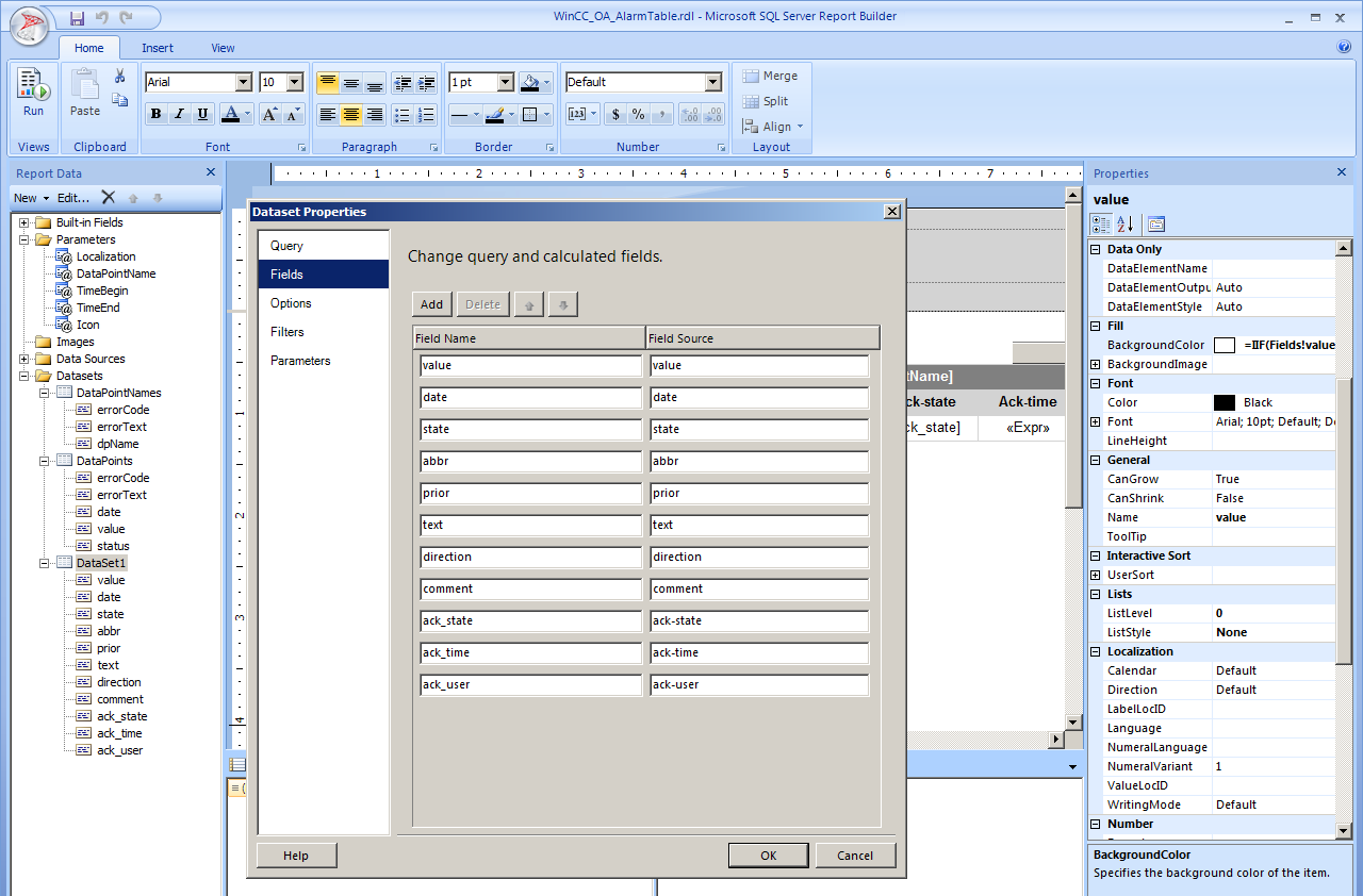 Note:Hyphens may not be used for the field names!Figure 4. Microsoft SQL server Report Builder - Dataset fields