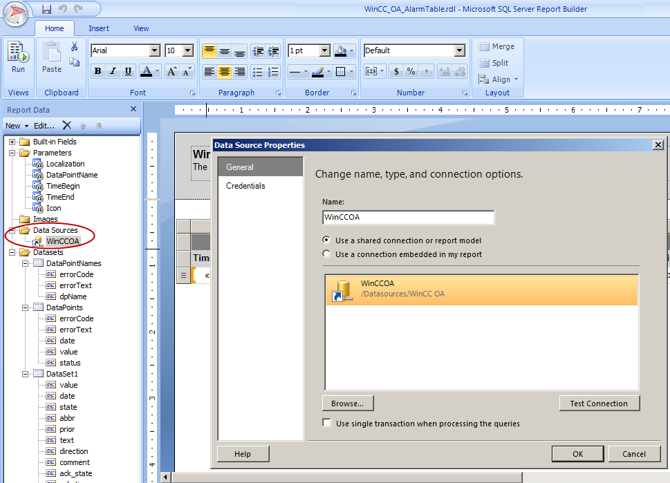 Create an XML data source (embedded) by selecting the " WinCC OA" data source from the left side of the Microsoft SQL Server Report Builder window (see figure below). If you create a new report template, make sure that your report template contains the following code: