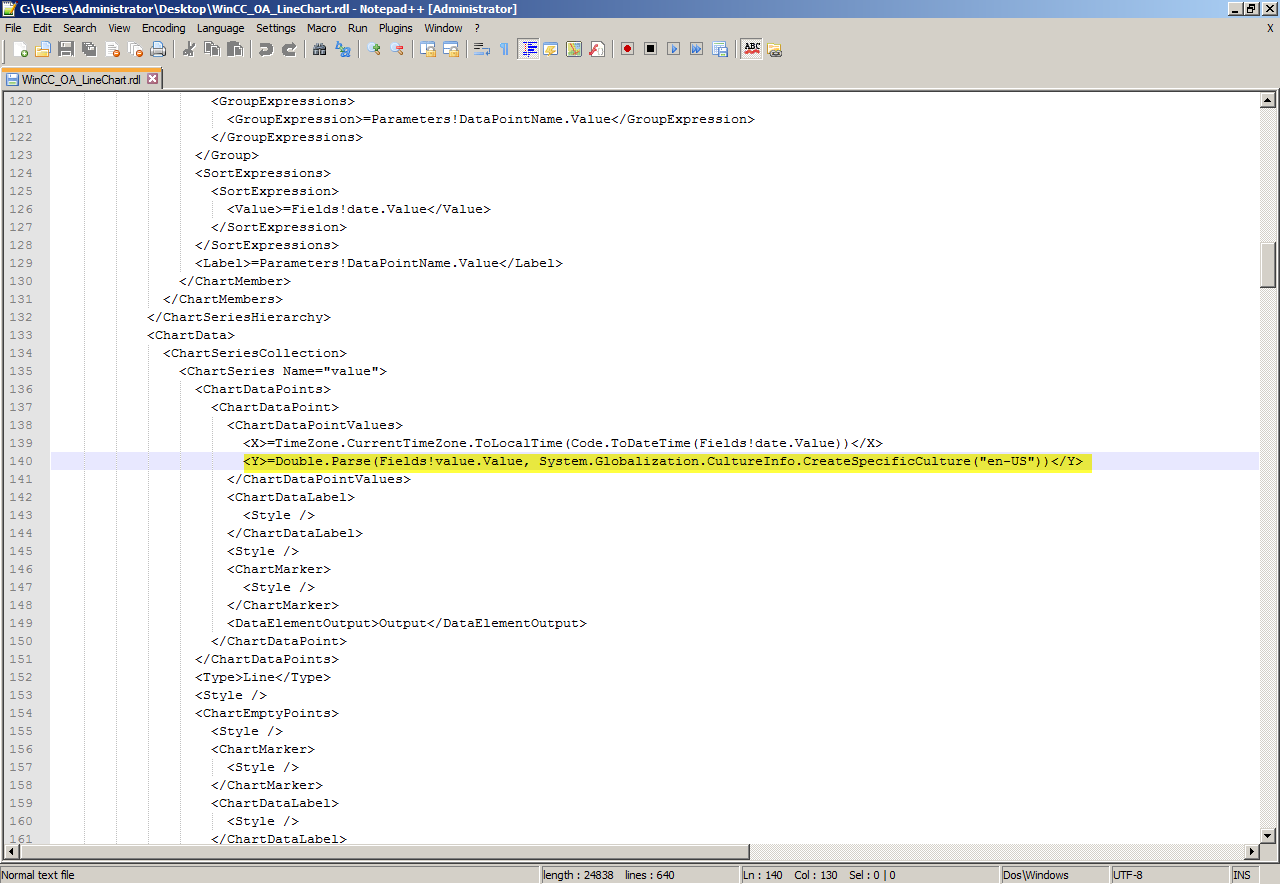 Take care when interpreting datapoint values numerically by rendering them graphically (e.g. in charts). Internally, the Reporting Services XML extension stores numeric data returned by the gSOAP service as strings. This results in unexpected behavior when attempting to interpret values on systems with mixed language configurations. For example, the SOAP value 123.456 might be numerically interpreted as 123456 because the expression evaluation might expect a comma instead of a full stop as a decimal delimiter. This problem can be avoided by using fixed culture parsing expressions instead of the plain value: