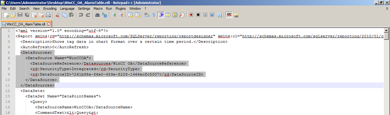 <DataSources> <DataSource Name="WinCCOA"> <DataSourceReference>/Datasources/WinCC OA</DataSourceReference> <rd:SecurityType>Integrated</rd:SecurityType> <rd:DataSourceID>7261b98e-86e0-459e-8228-1466ecfc5007</rd:DataSourceID> </DataSource> </DataSources> -