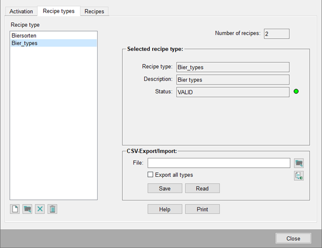 Prints all types that exist, including description, status and today's date, if you have no recipe type selected. If you want to print only one specific recipe type, select the desired entry and click on Print.