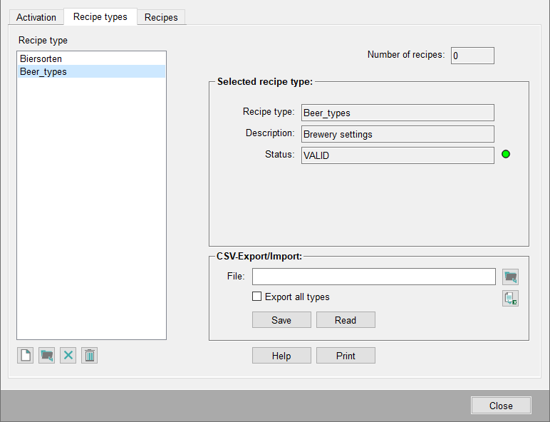 If you have set the parameters correctly then the entry is added to the list of recipe types and is given the status of valid: