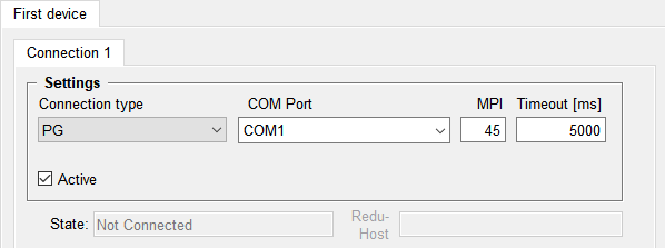 This check box is used in order to set the connection to the peripheral device active or inactive. You can deactivate a connection that is already created and configured. The connection datapoint is not deleted and can be reactivated at any time. The status display changes from "Connected" to "Not Active"; if a connection is deactivated.
