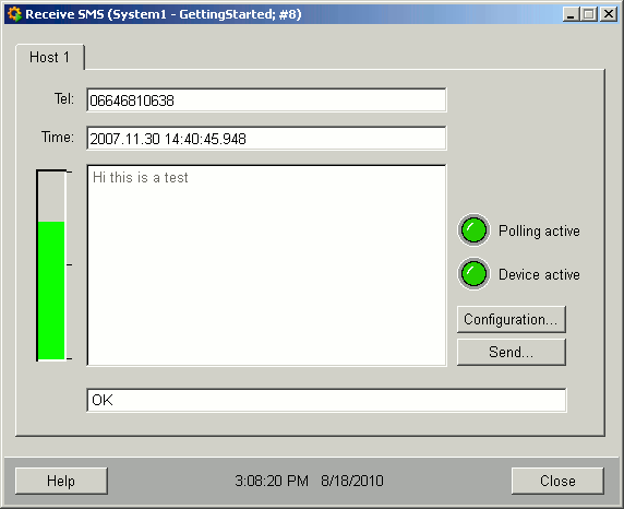 Received SMS with the phone number of the sender, time of the SMSC (Short Message Service Center) and the message text. You can see the phone number of the sender and the send time in respective text fields Tel and Time.
