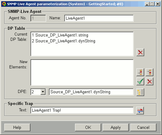 Open the SNMP configuration panel via System Management > Driver > SNMP Manager. Open the Live Agents tab and create a new Live Agent "LiveAgent1" with the number 1 via the New button. configure the Live Agent via double click on the agent or via right click on the agent by selecting the Param option from the context menu. Select the string element of the datapoint Source_DP_LiveAgent1 with the aid of the datapoint selector and apply the elements in the current DP table. Select in the same way the dynString element of the datapoint.