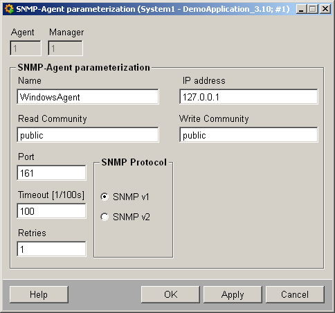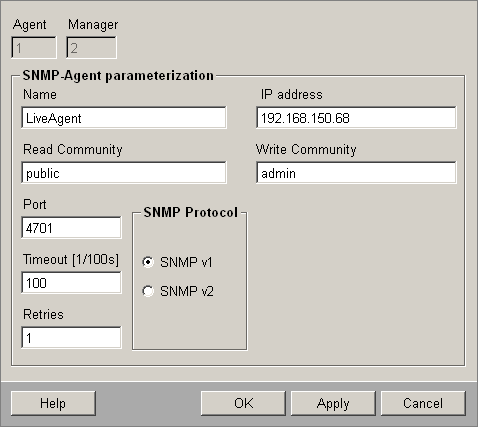 Configure the SNMP agent named "LiveAgent". The agent should be queried by the SNMP manager. Enter the IP address of the computer on which the agent runs. Add the read and write communities "public" and "admin" as well as the port number 4701. Timeout should be 1000 msecs. This defines how fast you should get a reply to a SNMP message. Retries defines that a message should be resent 1 before an error is shown. In this example the protocol type SNMP v1 is used.