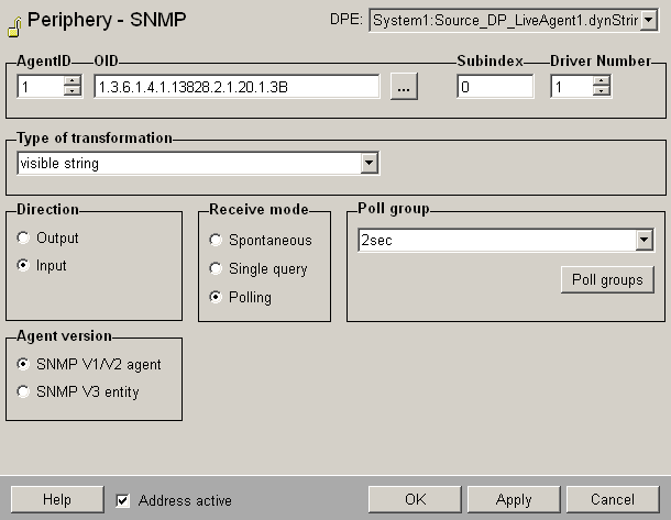 Add a SNMP address config to the string and dynString datapoint elements of the datapoint "Data_of_LiveAgent1" (right click on the datapoint and choose the option Periphery address. Choose the SNMP option.