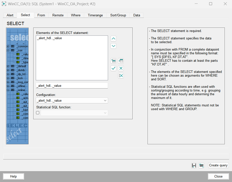 The SELECT statement specifies values to query from the DB. It must consist of at least "KF.DT.AT" (config_level.detail_level.attribute_level). Using the Configuration combo box you can select which datapoint attribute (for messages see _alert_hdl) of a datapoint/data point element to query.