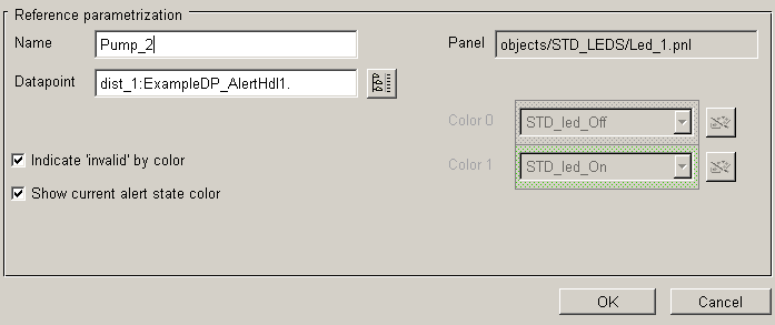 This symbol, like most of the others, has options to display the alert color ("Show current alert state color") and the invalid color ("indicate "invalid" by color") in the reference editor. By default, the on/off status is displayed by STD_led_Off/STD_led_On, but you can define other colors using the Color Editor. When the alert color is selected ("Show current alert state color") the status color is grayed out.