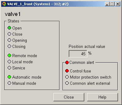 The information panel contains details on the associated datapoint elements. Please see the chapter datapoint types for the symbol catalog (see SLIDE_VALVE1) in the PARA module for a description of the datapoint types and their elements.