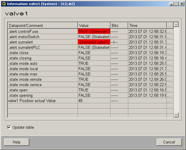 The table contains all datapoint elements either with their name or description, their values (contents), status (bits) and source time. The "..." buttons open detailed information on the event or alert (see alert table).