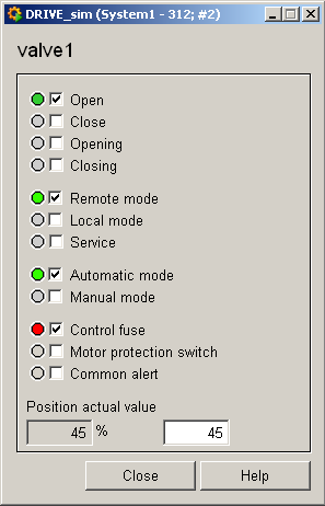Right-click on the symbol or select the Simulation menu to open the following panel for simulating a peripheral device. This panel can be used to set datapoint elements by hand. The above equipment operational panel can be displayed with the following inputs in the simulation panel (see Simulating operational states):