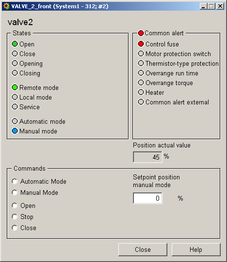 The information panel contains details on the associated datapoint elements. Please see the chapter datapoint types for the symbol catalog (see SLIDE_VALVE2) in the PARA module for a description of the datapoint types and their elements.