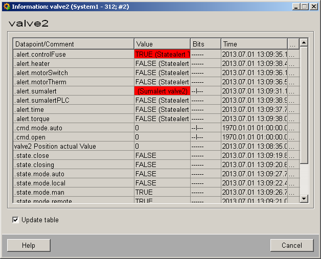 The table contains all datapoint elements either with their name or description, their values (contents), status (bits) and source time. The "..." buttons open detailed information on the event or alert (see alert table ).