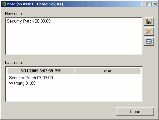 In order to add a new note click in the table, enter a note and save the note using the button on the right (see image The Notice Board "note_info.pnl" below).