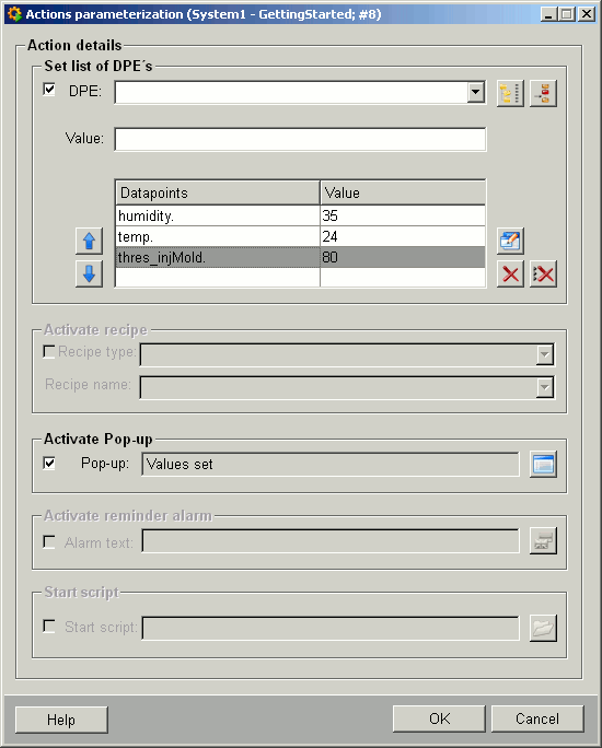 In the action configuration window you can define different actions you want to be executed. You can set the scheduler to change the values of datapoint elements, activate recipes, show a pop-up message, activate an alarm or start a self defined script when the created scheduler condition is fulfilled.