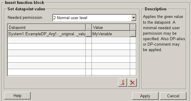 For more information about the function "write value on datapoint" please refer to the WinCC OA 3.11 online help by clicking on the push button "Help".