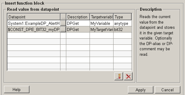 For more information about the function "read value on datapoint" please refer to the WinCC OA 3.11 online help by clicking on the push button "Help".
