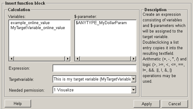 Click on the push button "Apply", then an expression is created and will be assigned to the target variable. This setting is then applied to the current function.