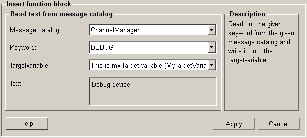 Click on the push button "Apply" and the text from message catalog is read and written onto the target variable. This setting is then applied to the current function.