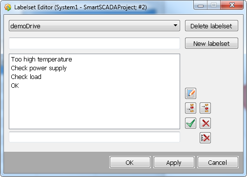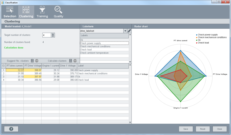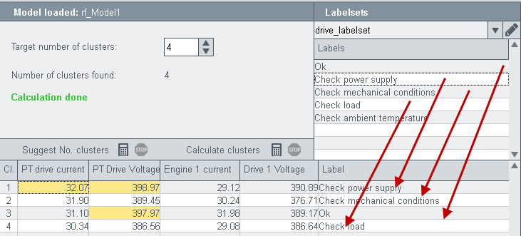 Add labels to the clusters via drag and drop. By using the labels you designate different states to clusters. In this way you specify which values are OK and which are not OK as well as what to do, for example, "Check power supply". In other words, Clusters specify which states are assigned to which datapoint values in a WinCC OA system. The cluster values can also be changed in the table (see the second figure below).