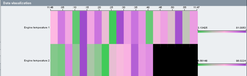 The values are displayed starting from the left side. When the number of values for the different datapoints selected for the session is unequal. In other words the amount of values is different for the selected datapoints, black spaces are shown in the data visualization. See figure below: