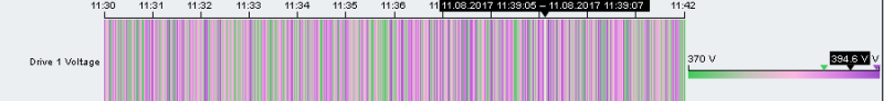 The data visualization shows the selected datapoints on a time line. You can display a value at a specific time by moving the mouse along the time line. The value at a specific time is shown above the time line and on the right on the smaller time line.