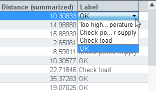 The Training panel represents all values of the selected time range. The time range was selected in the Selection panel. The column "Distance" displays the distance between this specific value and the cluster average value. This specific value is an absolute value. The cluster average value is visible in the "Clustering" panel.