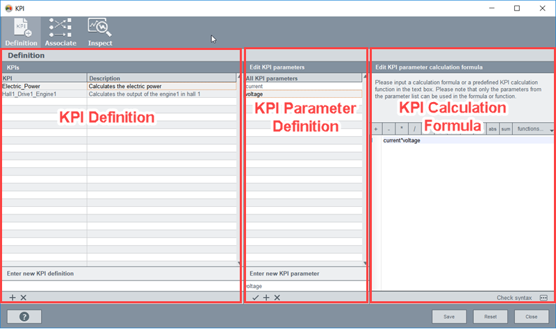 The panel consists of the following parts: KPI Definition, KPI Parameter Definition and KPI Calculation Formula