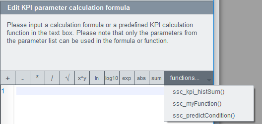 Create a formula or use a predefined function from the wincc_oa_path/SmartSCADA_3.20/scripts/libs/SmartSCADA/kpi/kpiFunctions.ctl library. To create a formula, drag a parameter from the table to the Formula table or type the parameter name into the formula table. Use the buttons with the functions (see figure below) to create a formula or type the mathematical operation into the formula table.
