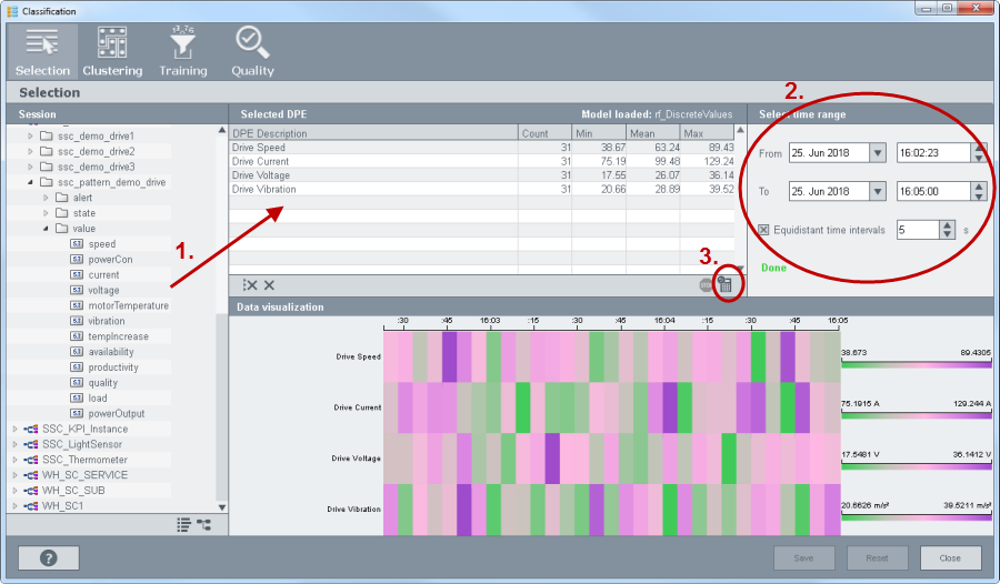 Select the DPs "ssc_pattern_demo_drive_value.speed", "ssc_pattern_demo_drive_value.current", "sc_pattern_demo_drive_value.voltage" and "sc_pattern_demo_drive_value.vibration" from the datapoint view. Drag these DPs to the model.