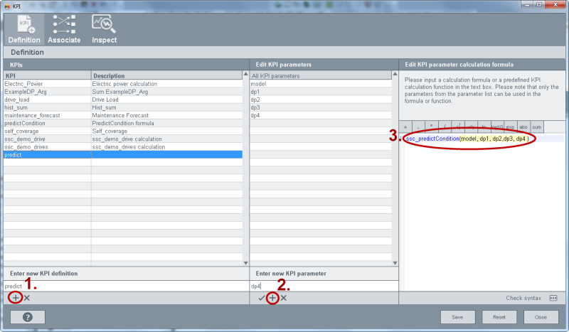 In the "Edit KPI Parameter calculation formula" field, enter the function "ssc_predictCondition" and the parameters for the datapoints as well as for the model: ssc_predictCondition(model, dp1, dp2,dp3, dp4 ). You can drag the parameters to the function as soon as you have created the function ssc_predictCondition() in "Edit KPI Parameter calculation formula" field.