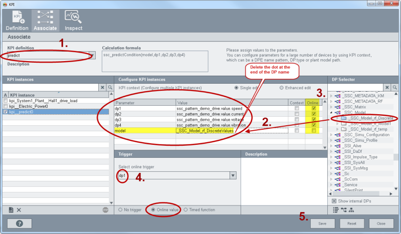 Assign the same DPs as you selected in the Classification wizard - Selection panel, now under "Configure KPI instances". To select the datapoints check the check box "Show internal DPs" and select the model, which you created in the Classification wizard in the Selection panel, from the internal DP type _SSC_Model.Note that you have to add the whole model datapoint and delete the dot at the end of the DP name (see figure below).