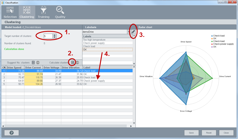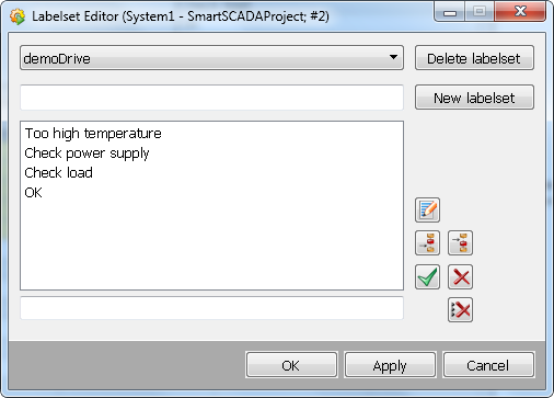 Create a labelset with labels of your choice. In this example the labels "Too high temperature", "Check power supply", "Check load" and "OK" are created.