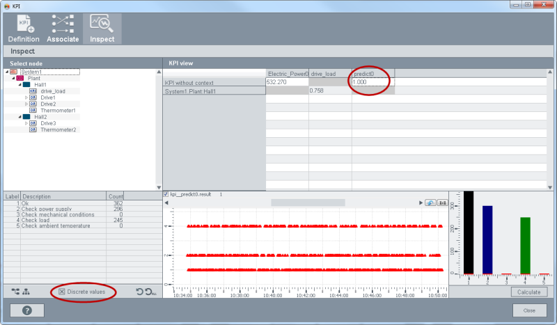 The Discrete Values check box is only available when a KPI Instance is based on the built-in ssc_predictCondition function and the KPI instance is selected in the inspect panel. The ssc_predictCondition calculates a system state based on the previously generated Random Forest model and the current values. The Discrete Values check box switches from a continuous view to a categorical view in the inspect panel. The following example use case shows predicted labels and the frequency of the labels in the system as well as displays a histogram. It describes how to define a KPI which is based on the ssc_predictCondition function and the usage of the Discrete Values check box.
